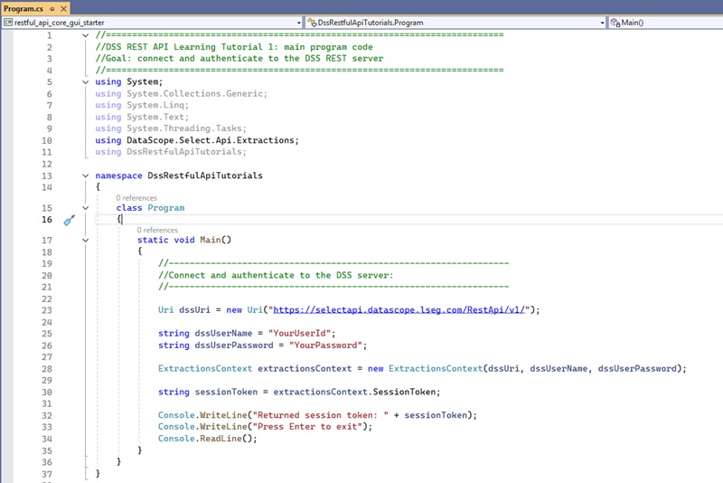 Navigate to the \DSS REST API\Tutorial 1\Learning folder; double click on restful_api_core_gui_starter.sln to open the solution in Microsoft Visual Studio: