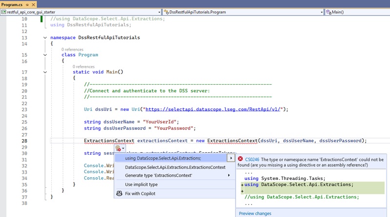 At the top of the code we see a using directive referring to DataScope.Select.Api.Extractions, giving us access to the types of the DSS API namespace, so that we do not have to qualify the full namespace each time we use them. It is followed by a second using directive, referring to the namespace of our code, DssRestfulApiTutorials: