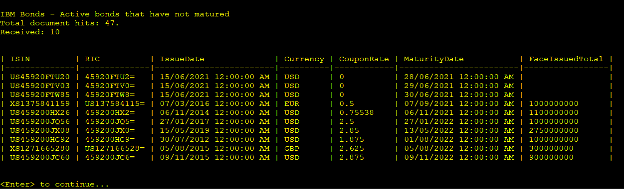 The clear difference in the above result vs the first one is the number of document hits. We can clearly see we have narrowed down the number of bonds returned. In addition, the result set contains details relevant to the type of data we pulled out, such as the ISIN, Coupon Rate, and Maturity Date.