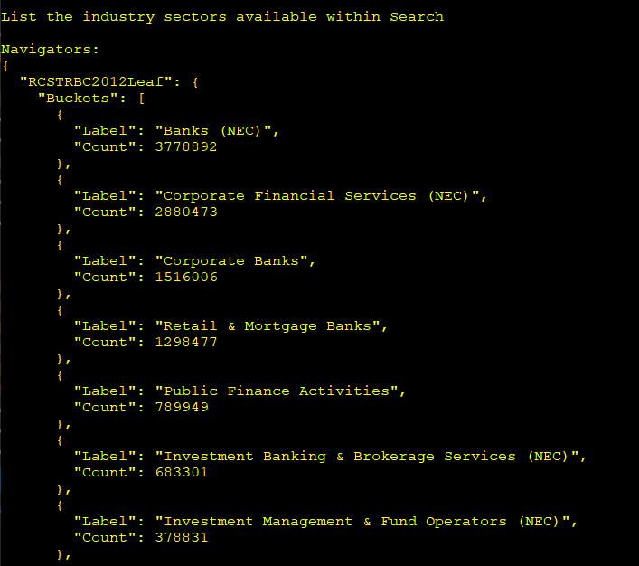 The result of this specific request contains an array of buckets representing a list of industry sectors and a distribution of the number of documents available within each sector. Navigators are extremely useful for a number of different applications. Not only to gather values within a category but also to perform ways to organize your distribution based on ranges, calculations, and distribute values as histograms. Refer to the additional readings section for details around the power of Navigators.