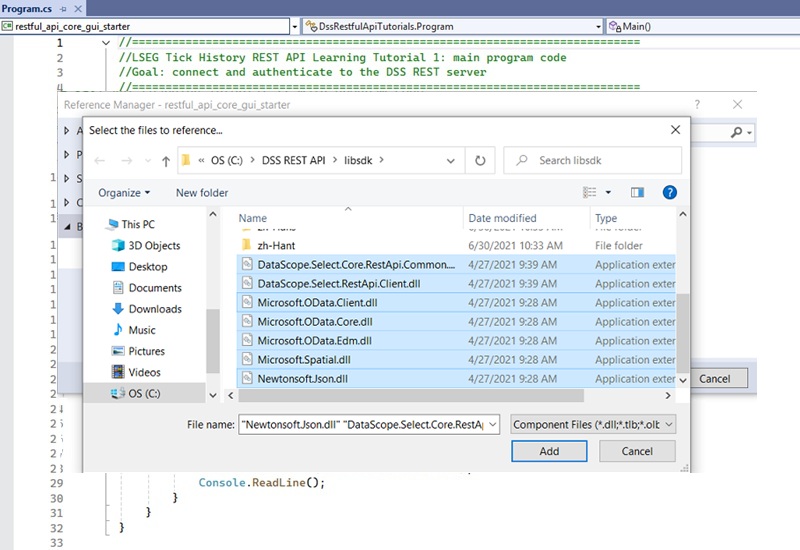 Before anything else, you must reference the LSEG Tick History REST API .Net SDK in the Microsoft Visual Studio project.