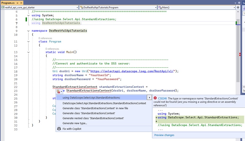 At the top of the code we see a using directive referring to DataScope.Select.Api.StandardExtractions, giving us access to the types of the DSS API namespace, so that we do not have to qualify the full namespace each time we use them. It is followed by a second using directive, referring to the namespace of our code, DssRestfulApiTutorials: