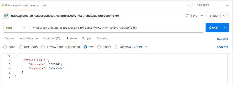 Important note: before running this particular request, replace the Username and Password values with those of your own DSS account !
