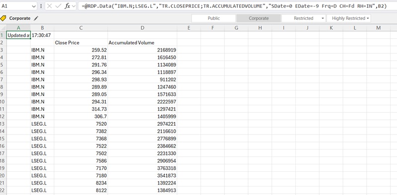 =@RDP.Data("IBM.N;LSEG.L","TR.CLOSEPRICE;TR.ACCUMULATEDVOLUME","SDate=0 EDate=-9 Frq=D CH=Fd RH=IN,date",B2)
