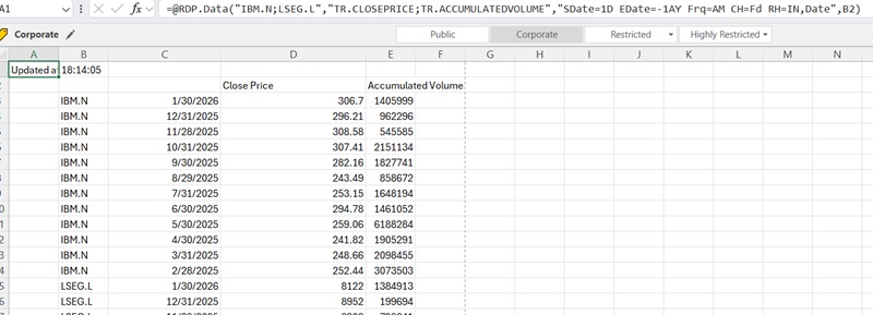 | =@RDP.Data("IBM.N;LSEG.L","TR.CLOSEPRICE;TR.ACCUMULATEDVOLUME","SDate=1D EDate=-1AY Frq=AM CH=Fd RH=IN,Date",B2) |