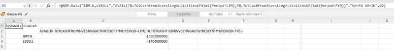 | =@RDP.Data("IBM.N,LSEG.L","AVAIL(TR.TotCashFromInvestingActivitiesCFStmt(Period=LTM),TR.TotCashFromInvestingActivitiesCFStmt(Period=FY0))","CH=Fd RH=IN",B2) |