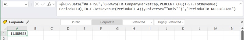| =@RDP.Data("0#.FTSE","GRWAVG(TR.CompanyMarketCap,PERCENT_CHG(TR.F.TotRevenue(Period=FI0),TR.F.TotRevenue(Period=FI-4)),universe=""univ"")","Period=FI0 NULL=BLANK") |
