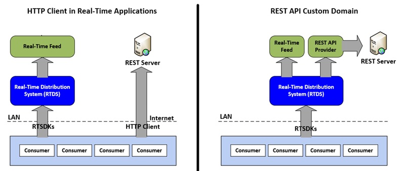 - Network settings: REST services are typically hosted on Internet, so all consumer applications must be allowed to directly connect to it. This may violate the company’s network or security policies. However, with the REST API custom domain, consumer applications can use existing Real-Time Distribution System (RTDS) connections to access data from REST services.